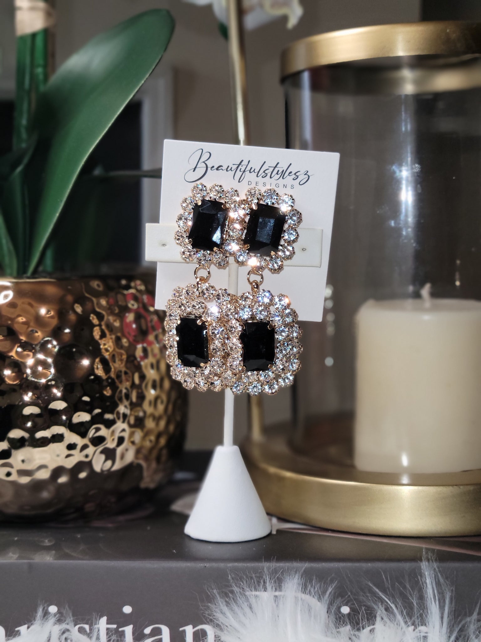 Gold Diamond cluster drop earrings with large black stone